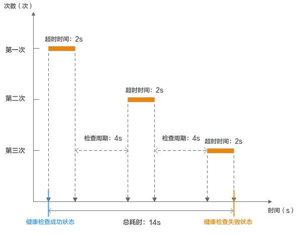 健康检查成功时间窗 = 超时时间×最大成功重试次数 + 检查间隔×(最大成功重试次数-1) 健康检查失败时间窗 = 超时时间×最大失败重试次数 + 检查间隔×(最大失败重试次数-1)如图3所示: