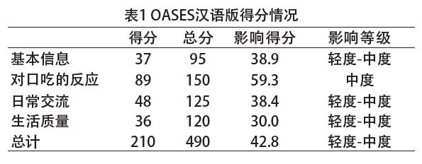 通过患者的个人报告和OASES汉语版显示(见表1),患者对口吃的反应对他的生活有中度影响,如当他在意识到自己口吃时,经常会产生焦虑、尴尬和受挫感;有时会有无助感、羞耻感;当患者口吃时,身体会频繁地紧张,避免在特定场合或特定人群中发音,并且在一次口吃后会加重口吃情况;有时讲话流利时身体也会紧张,有时会让其他人替自己说话。基本信息、日常交流、生活质量和总体得分显示口吃对他生活的日常交流和生活质量有轻度到中度影响,尤其在工作场合中,他认为在使用电话、口头陈述、参加会议、与老板讲话都有点难,但与家庭成员和朋友交流没有困难。这里是指患者对各种情景发出交流的困难度,而不是流利程度。