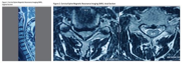 患者中年男性,主要症状为亚急性进展性四肢无力,伴上运动神经元损伤导致的运动功能及肌张力障碍。颈椎MRI显示,颈3/4和颈4/5椎体不稳,脊髓严重受压,椎管狭窄。