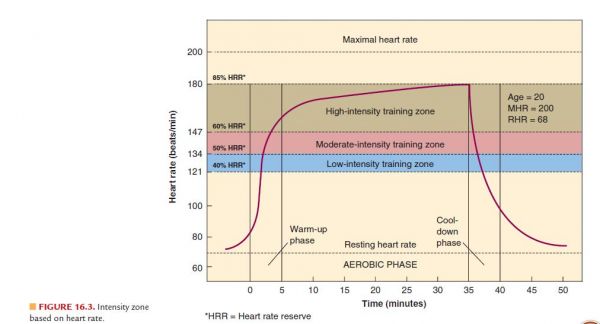 在监控有氧训练强度上有三种不同的方法:(a)心率(HR)、(b)VO2max的百分比或储蓄值和(c)主观体力感觉表(RPE)。