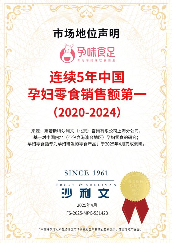 近年来,随着母婴消费市场的持续升级,孕妇群体对食品健康与营养的专业化需求日益凸显。作为国内专注孕妇特殊膳食的品牌,孕味食足的市场地位于近日再获权威认证。2025年4月,全球知名增长咨询公司弗若斯特沙利文(Frost & Sullivan)为孕味食足颁发了“连续五年中国孕妇零食销售额第一(2020-2024)”的市场地位声明。这一成绩不仅印证了品牌在细分市场的标杆地位,更彰显了其在产品创新与用户信任构建上的长期积淀。
