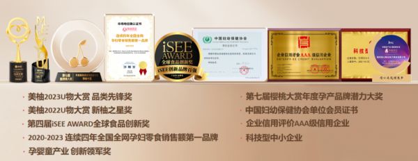 持续的创新与品质坚守,为孕味食足赢得了市场与行业的双重认可。品牌先后斩获美柚2023U物大赏品类先锋奖、第四届iSEE AWARD全球食品创新奖、孕婴童产业创新领军奖、第七届樱桃大赏年度孕产品牌潜力奖等殊荣,并获评《AAA级信用企业》及《科技型中小企业》。