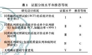 2.证据水平及推荐等级:参照 2001年英国牛津循证医学的证据分级与推荐意见强度,将证据水平分为Ⅰ、Ⅱ、Ⅲ、Ⅳ、Ⅴ5个级别,推荐等级分为A、B、C、D4 个等级(表1),结果以[证据水平/推荐等级]表示。