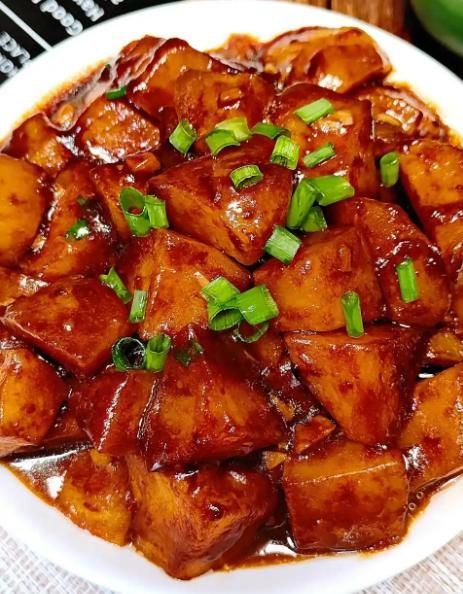 收汁装盘:待土豆块熟透,汤汁浓稠时,转大火收汁。收汁过程中用铲子轻轻推动土豆块,确保每一块都均匀裹满酱汁。最后撒上葱花,一道色泽红亮、软糯香甜的红烧土豆块就完成了。土豆富含膳食纤维,饱腹感强,是低脂晚餐的不错选择。