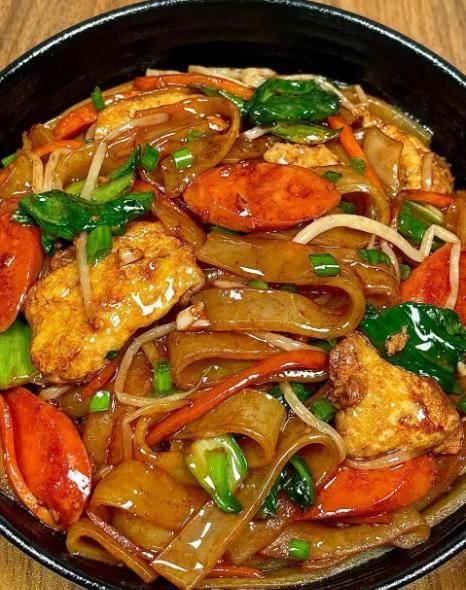 加入河粉:放入泡软的河粉,用铲子轻轻将河粉与配菜混合均匀。加入 2 勺生抽、1 勺老抽、1 勺蚝油和适量盐调味,翻炒均匀,让河粉充分吸收调料的味道。