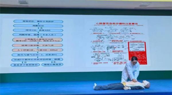 会上,医院心内科专家的讲解同样引人关注。专家围绕常见职业病防治措施展开详细讲解,涉及粉尘防护、噪声控制、热射病预防等多个方面。为了让参会人员能够切实掌握工伤应急处置技能,现场还开展了工伤应急处置专题教学。通过理论讲解与模拟实操紧密结合的方式,以人体模型现场演示胸外按压频率、人工呼吸标准流程等关键急救要点。这种直观、实用的教学方式,确保参训人员能够简单快速掌握相关技能,有效提高了大家的工伤预防意识,为减少工伤发生提供了有力保障。