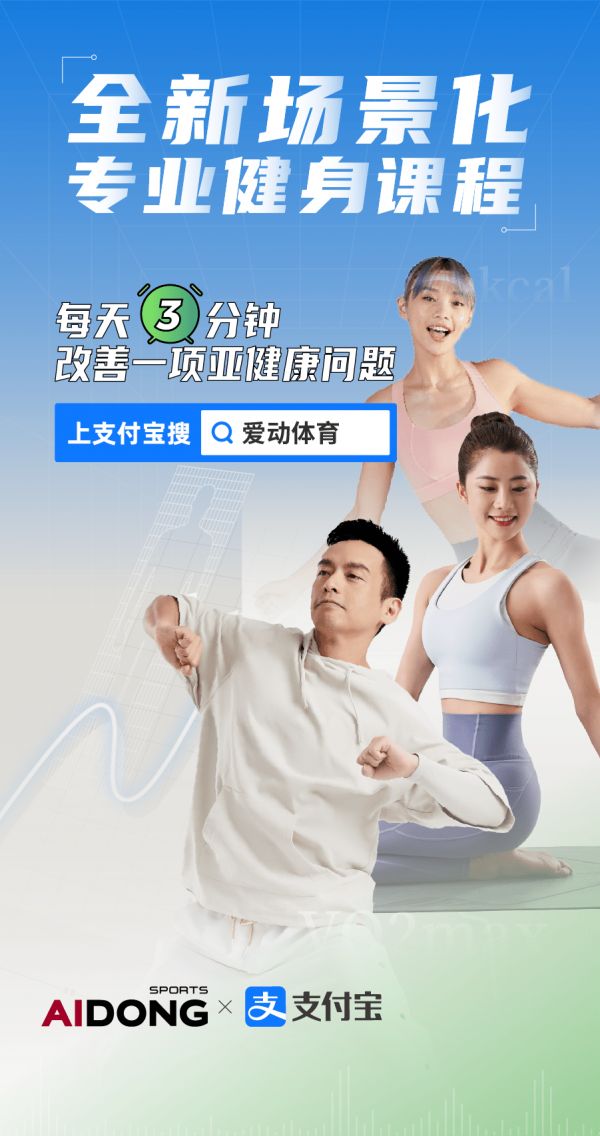 此次,爱动体育与支付宝运动的重磅合作,是海量优质用户平台与专业健身内容智库的强强联合,将为所有人群带来更科学、更便捷的运动健身体验,随时随地可开展短时高效的健身活动,将健康意识与行动潜移默化地融入每个人生活的日常。