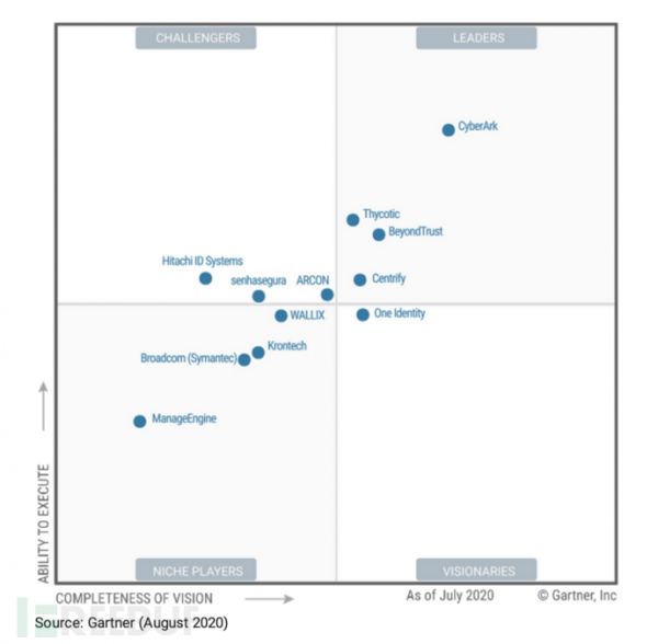 对于一个企业安全管理者,在了解了上文关于特权账户的相关内容后,下一步就要关注如何进行管理?有哪些解决方案?按惯例,我们先看成熟的特权账户解决方案有哪些?Gartner在2018、2020年分别发布了一版特权账户管理魔力象限图,图中处于领导者象限的几个企业包括Cyberark、BeyondTrust、Centrify等,可惜的是,一,这些企业在国内有大量业务开展的只有第一个,其他几个还没有什么代理机构,二,这张图中没有国内企业上榜。另外还有IBM、Oracle等企业也有自己特权账户产品。