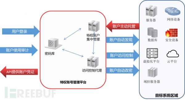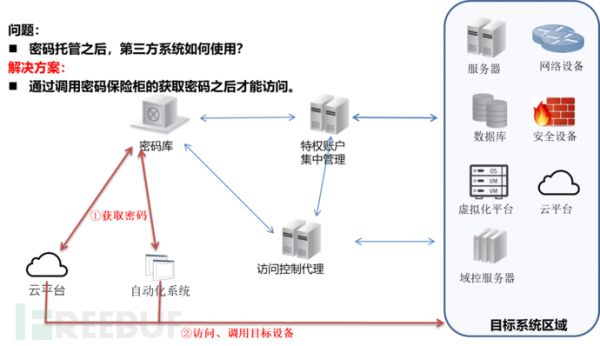 5、提供密码调用服务:密码口令托管之后,如果不能提供有效的API接口供下游系统调用,那么,特权账户管理平台要对密码进行定期修改的功能就不能实现。因此,特权账户管理要能为第三方系统提供API调用服务。笔者认为,这是国内堡垒机厂商被排除在PAM厂商之外的主要原因,国内堡垒机很早就具有了账户管理功能,能够托管一些账户密码,但是他们不具有提供API调用能力,导致他们只能修改一些不会被其他人使用的账户密码,需要被其他系统使用的密码只能保持固定不变。