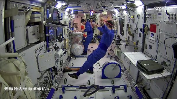 资料图:2022年3月31日,神舟十三号乘组正在太空加强失重防护锻炼,为返回前做准备(图片来源:中国载人航天工程办公室)