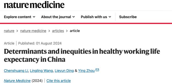 2024年8月1日,华中科技大学智能健康住宅研究中心周迎教授团队在Nature Medicine(IF=58.7)在线发表题为“Determinants and inequities in healthy working life expectancy in China”的研究论文,该研究提供了健康工作预期寿命(HWLE)的估计值,定义为50岁后预期健康工作的平均年数,并强调了健康工作预期寿命在性别、社会经济地位和地理区域之间的巨大不平等。
