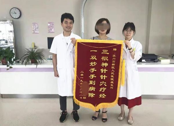 经过几次埋线治疗后,她不仅成功地从原来的68公斤减到原来54公斤,恢复了以前的窈窕身姿;而且,伴随的月经周期紊乱以及焦虑症状也慢慢消失。这让她非常高兴,便特地来到医院,将“三根神经针穴疗经,一双妙手手到病除”的锦旗送给医院康复医学科,以表达感激之情。