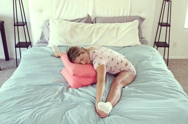 屈左膝于身体前侧,右腿保持伸直状态。确保髋部位置居中,身体舒适地俯卧于抱枕之上。在此姿势下,让身体完全放松,维持30秒至1分钟的静息时间。之后,换另一侧进行相同动作。