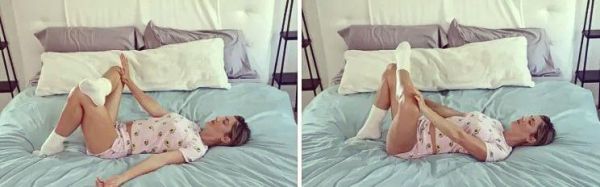 仰卧于床上,双膝微屈,双脚并拢。随后,双腿缓缓向外展开,若觉得腿外侧不适,可垫上抱枕以增加舒适度。将一手轻置于胸腔,另一手则放在腹部,专注于自己的呼吸节奏,维持此姿势30秒至1分钟。