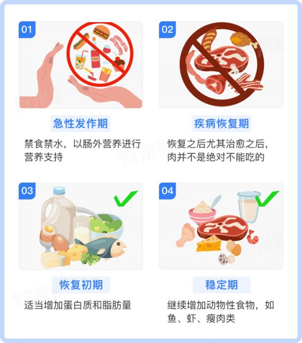 绝对禁食:在急性胰腺炎发作的早期,患者需要完全禁食,避免食物和胃酸刺激胰腺分泌消化酶,加重病情。禁水:在急性期,甚至水分摄入也需要暂停,以减少胰腺分泌。2、恢复期