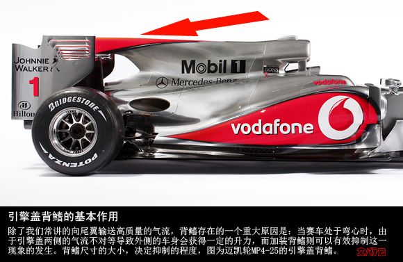 (编辑注:这部分基本是理论教学!着重讲述了背鳍存在的一个重大原因是:当赛车处于弯心时,由于引擎盖两侧的气流不对等导致外侧的车身会获得一定的升力,而加装背鳍则可以有效抑制这一现象的发生。背鳍尺寸的大小,决定了抑制的程度)