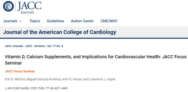 2021 年 1 月 25 日,美国约翰霍普金斯大学医学院预防心脏病学专家 Erin D. Michos 研究团队,在美国心脏病学会杂志《 JACC》上发表了一篇关于“维生素 D、钙补充剂对心血管健康影响”的综述文章。以下将对论文的亮点内容作简要介绍: