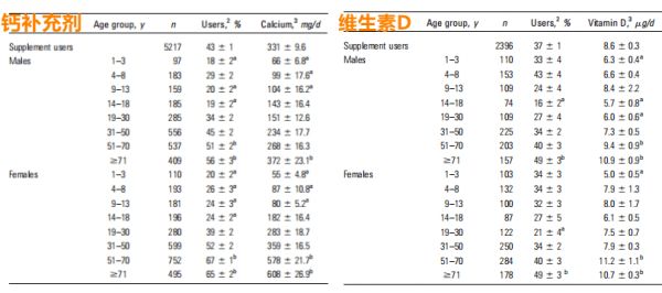 美国国家健康研究所(NIH)Regan L Bailey 研究团队,既往有统计过一定人群的钙补充剂和 VD 服用情况。研究同时对男女性不同年龄段人群的服用比例进行了统计,从下图可见,基本呈现出 年龄越高、服用人群比例越高的趋势: