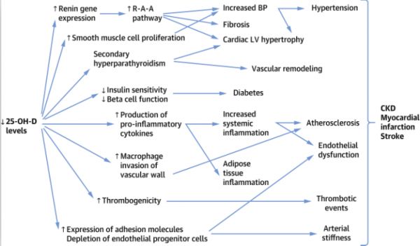 低 VD 血药浓度与心血管疾病风险增高的潜在可能机制众多,具体见下图: