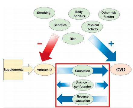 比如,较低的 25-羟化 VD 血药浓度,可能是由肥胖或户外运动少所致,这些健康相关因素都会影响心血管疾病预后结果。