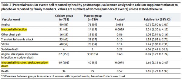 新西兰奥克兰大学医学院 Mark J Bolland 研究团队发表在《 BMJ》上的随机对照研究,纳入了 1471 例绝经后健康女性。研究发现, 钙补充剂组女性的心梗、复合终点事件(心梗、卒中或猝死)发生率,显著高于安慰剂组(P < 0.05)。