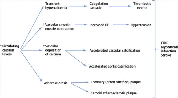 钙补充剂引起人体内钙水平的短暂或持续升高,与心血管疾病风险增高的潜在可能机制见下图: