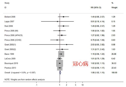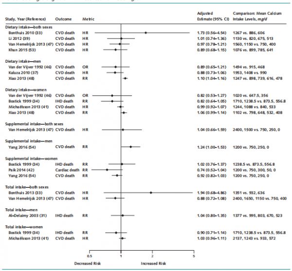 该论文有纳入 12 项队列研究,对比了钙摄入大于 1000 mg/d 与钙摄入小于 1000 mg/d 的人群,在心血管疾病发生风险及死亡率的差异。森林图结果如下: