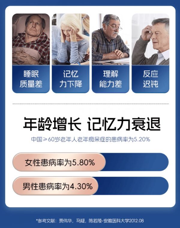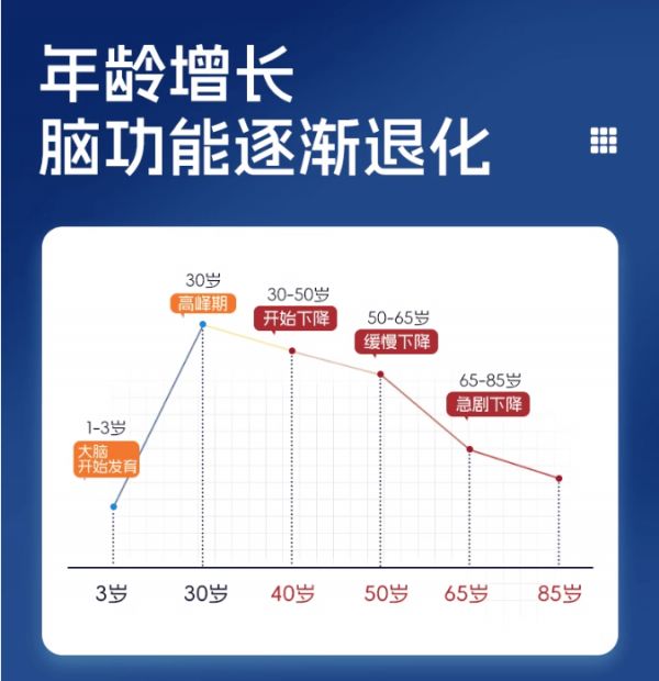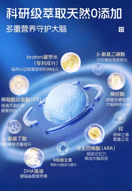 除了三大复合神经酸,还特别添加了营养神经的B族维生素、提高记忆力的BRAHMI 婆罗米、助眠安神的 γ- 氨基丁酸、益智健脑的锌,针对记忆力下降人群,提供丰富的健脑营养,帮助全面改善记忆力下降、脑神经退化等问题。