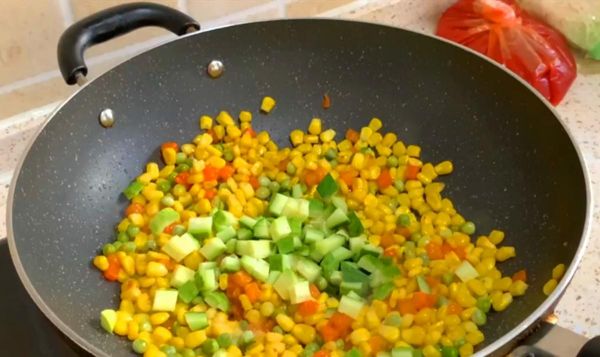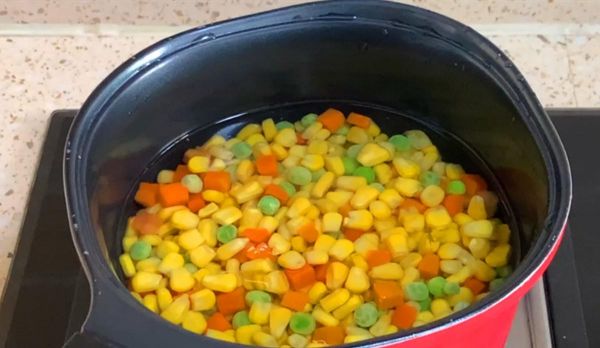 制作这道菜时,先将冷冻的什锦玉米粒解冻并洗净,然后将其投入滚水中焯烫1分钟左右,直到豌豆和胡萝卜变得软糯即可捞出。提醒一下,千万不要直接下锅炒,这样不易熟透。待到鲜玉米丰收季,不妨多储备些新鲜玉米粒,剥下冷冻,既经济实惠又方便快捷。