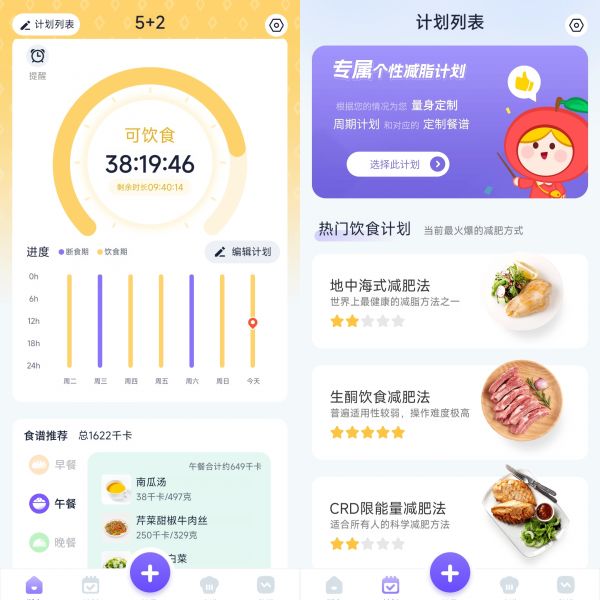 功能也是非常全面,包含热门的饮食减肥计划,以及减肥数据记录,对女孩子也非常友好,还有生理期的食谱推荐!真是很贴心!