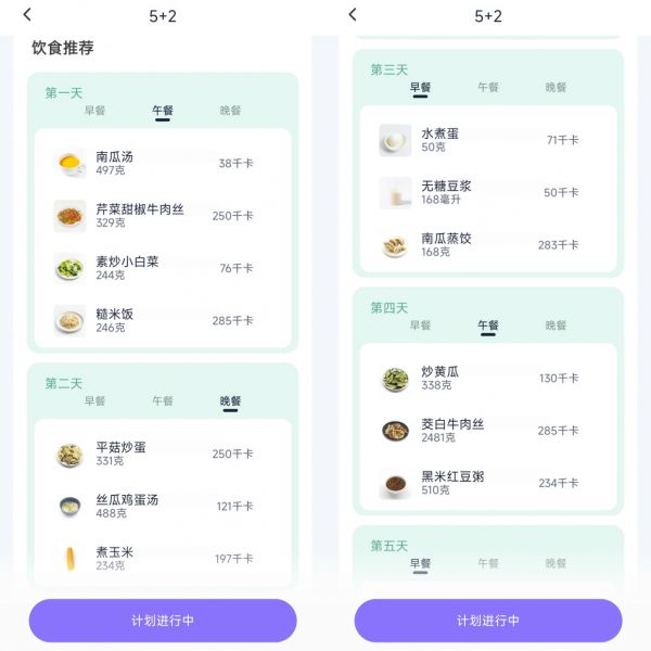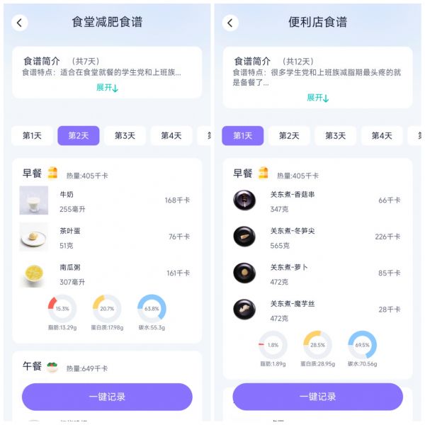 这里的食谱精确到每天早午晚餐,同时还有热量统计和三大营养分析。小编觉得最好用最棒的功能,就是还有食堂食谱和便利店食谱推荐,让每天吃食堂的打工人和学生党也有办法来进行饮食减肥!