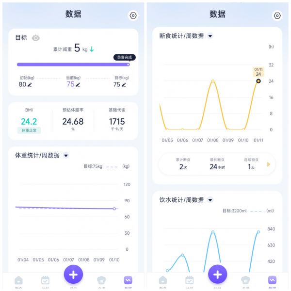 数据记录包含体重记录、BMI估算、体脂率和基础代谢估算,除此之外,还有断食统计、饮水统计和围度记录。整体功能非常强大,跟着用就能瘦。