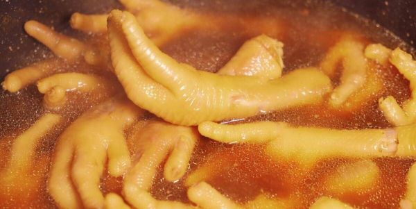 鸡爪:一斤,黄栀子:5颗,清水:适量,盐焗鸡粉:30g,姜片:3片,食盐:2勺,料酒:适量。