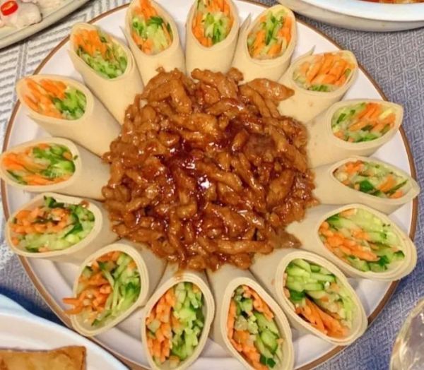 (3)卷食材:豆腐皮铺平,铺上一层黄瓜丝和胡萝卜丝,再放入一层小葱卷起来,再斜切成段,均匀地摆入盘中备用。