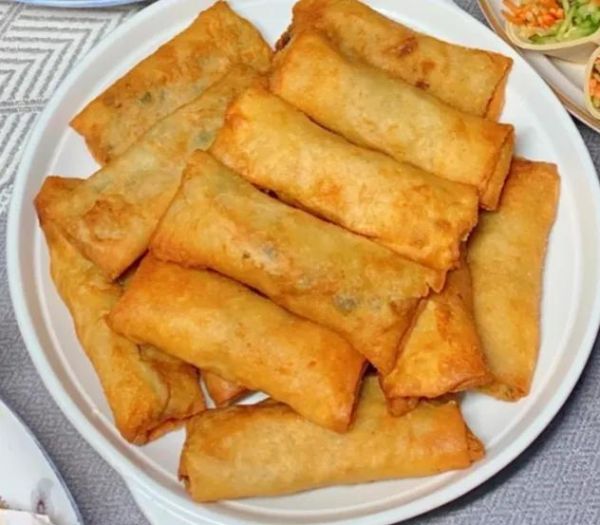 (6)锅中倒入适量的油,油温7成热后,下入春卷,小火慢炸至金黄色,盛出控油。