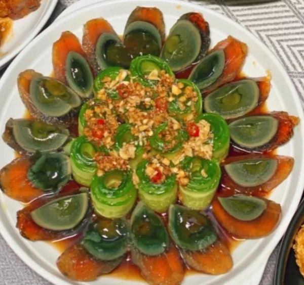 (4)盘中均匀地摆入切好的皮蛋,在中间放入黄瓜卷,再淋入调好的料汁。