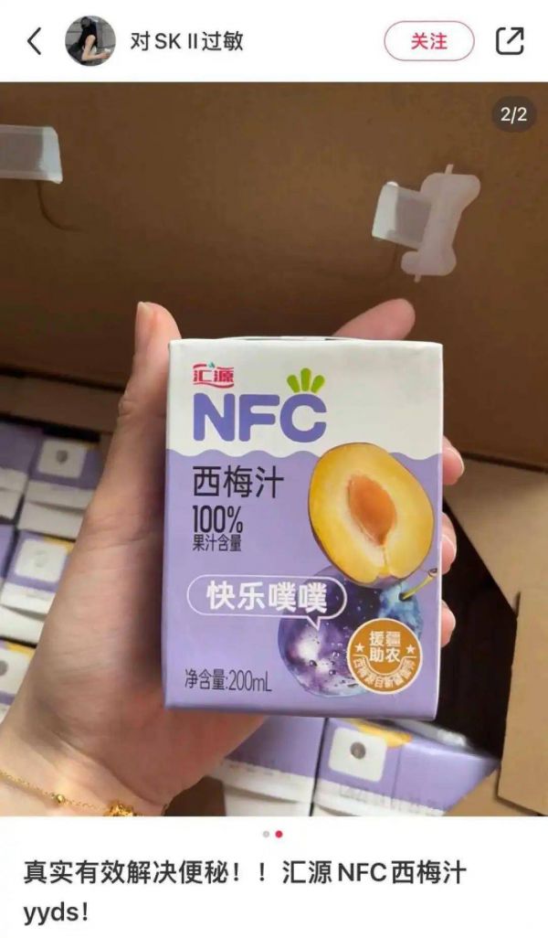 曾深陷破产危机的国民果汁品牌汇源就靠着西梅汁续了一波命。2021年9月,汇源推出了新品NFC西梅汁,不遮不掩,在包装上清楚明了写着“快乐噗噗”,因此一度被誉为“窜稀必备”,甚至还出现了“别买错了,汇源西梅汁记得买NFC那款才有用”的说法。