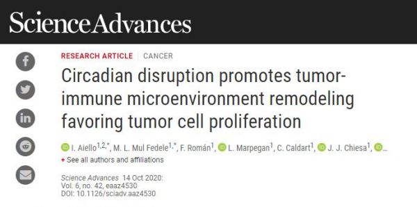 2020年10月《科学进展》期刊上的一篇文章曾提到,昼夜节律失调会改变肿瘤细胞周围的微环境,使其对肿瘤的生长更有利,也阻碍了人体的自然免疫防御。