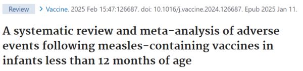 Vittrup DM, Charabi S, Jensen A, Stensballe LG. A systematic review and meta-analysis of adverse events following measles-containing vaccines in infants less than 12 months of age. Vaccine. 2025 Feb 15;47:126687. doi: 10.1016/j.vaccine.2024.126687. Epub 2025 Jan 11. PMID: 39799850.