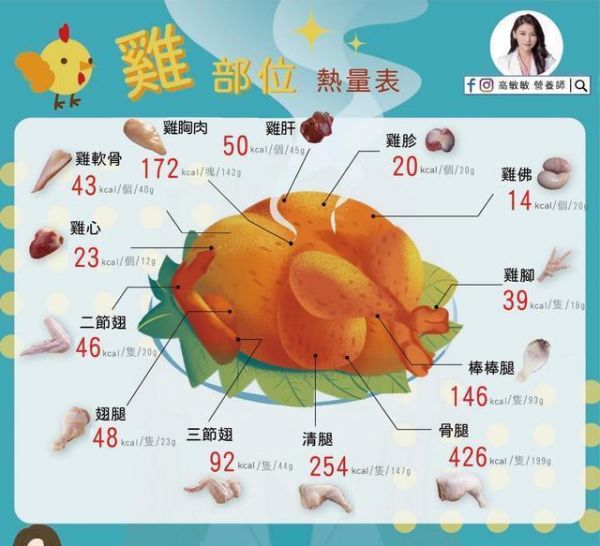 ▲营养师分享一张图,带你看懂全鸡各部位热量。