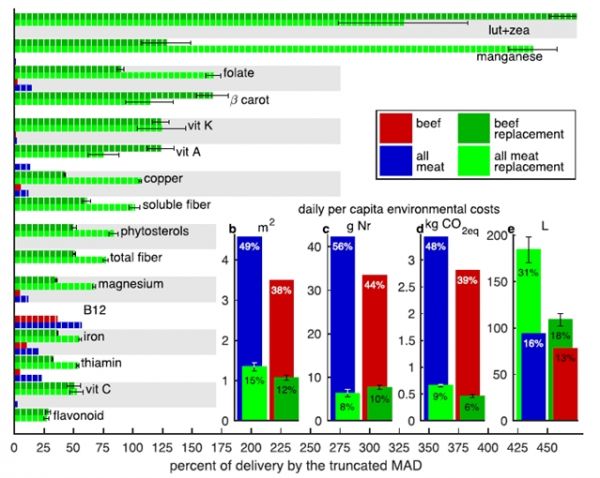 使用含有蛋白质的植物代替肉食,仍能满足美国人的关键营养需求,还可以废除牧场的使用,并将目前粮食生产所需的耕地减少35-50%。以上发现来自《科学报告》发表的一项模型研究Environmentally Optimal, Nutritionally Sound, Protein and Energy Conserving Plant Based Alternatives to U.S. Meat,研究表明氮肥和温室气体排放量也将减少,而只有粮食相关的用水会增加。