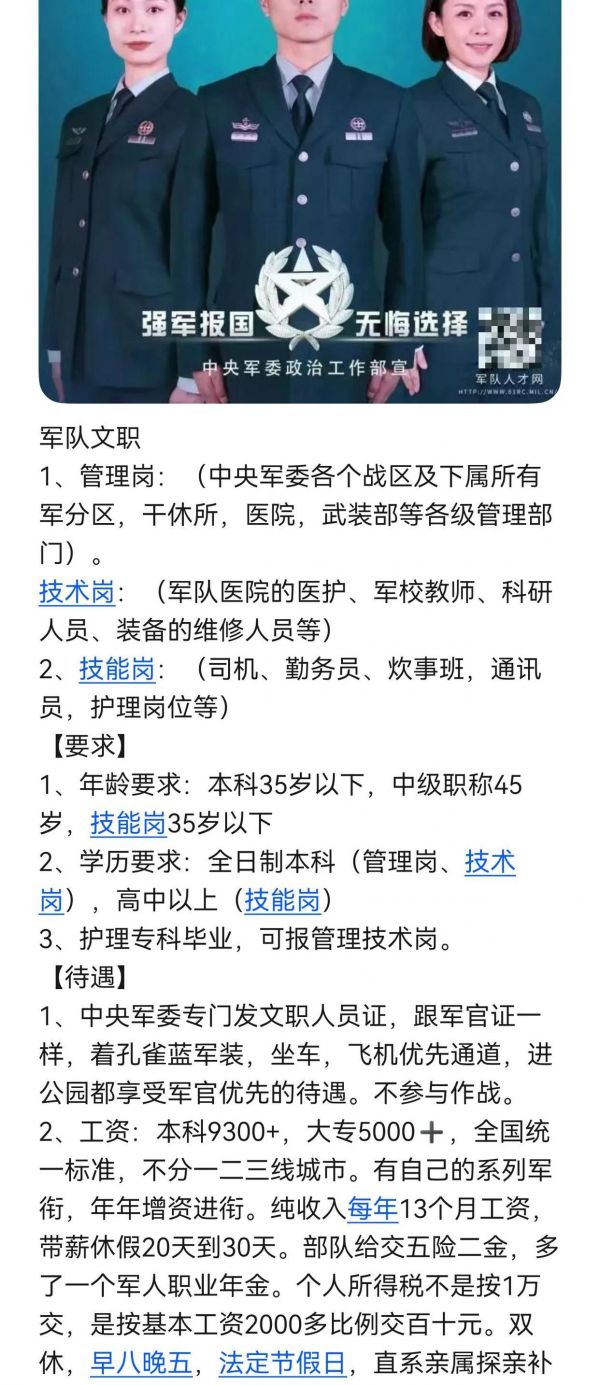 军队文职招聘!月薪9k+孔雀蓝军装 【...全文
