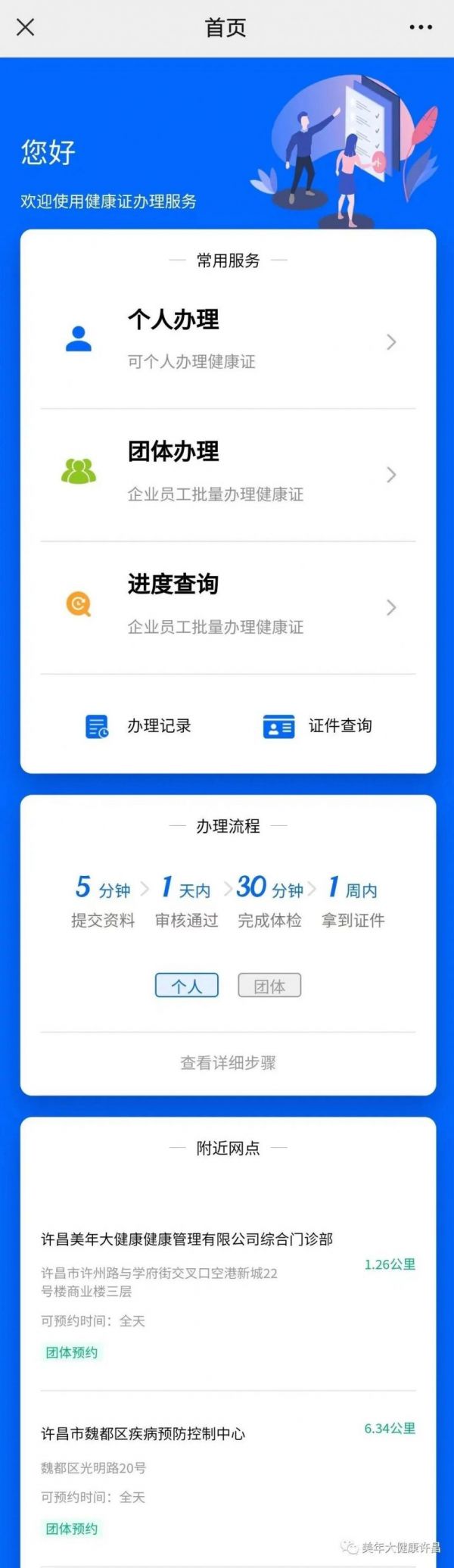 【导语】:网上预约可以在“美年大健康许昌”微信公众号进行体检预约,周二至周日上午办理,次日出证,更多信息请见下文