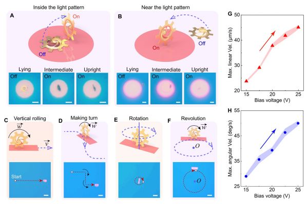 图3:纳米剪纸微型转子的多模态自由驱动实验。(A, B)微型转子的异平面翻转操控示意图及相应的实验捕获图像。比例尺:10 μm;(C-F)微型转子多模态驱动示意图和实验图像,包括垂直滚动、转向、自转以及公转。比例尺:30 μm;(G, H)在(C)和(F)驱动中微型转子的最大前进线速度和公转角速度与施加偏置电压的关系。