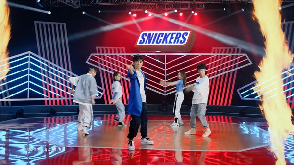 同样作为士力架和Nike的代言人,王俊凯在士力架广告中穿着有士力架品牌色的Nike红蓝运动服。广告片以酷炫舞台为场景,保有士力架主旋律——一饿就手软脚软、无法好好跳舞。