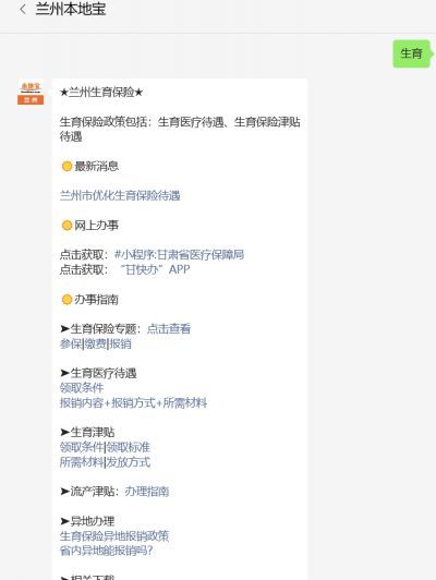 温馨提示:微信搜索公众号【兰州本地宝】,关注后在对话框回复【生育】可获生育保险参保+缴费+报销指南,网上申办入口、定点医院、产前检查费、生育津贴申报+发放等。