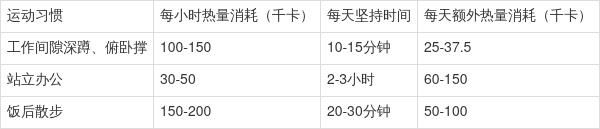 下面这个表格能让大家更清楚地看到不同运动习惯对热量消耗的影响: