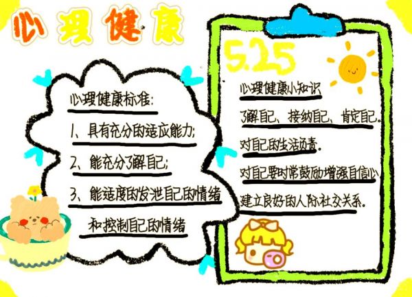本电子版手抄报以“心理健康标准”和“心理健康知识”为核心内容,通过简洁明了的布局和生动的卡通插图,旨在向大家普及心理健康的相关知识。