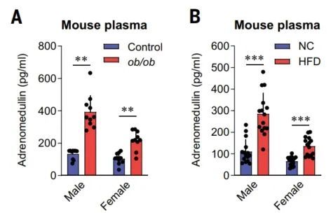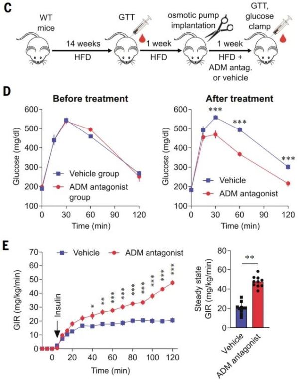 最后,研究者用肾上腺髓质素受体拮抗剂治疗了肥胖的2型糖尿病小鼠,显著改善了糖耐量和胰岛素敏感性。