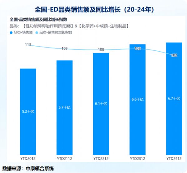 值得一提的是,根据中康瓴合数据显示,2024年全国ED品类市场规模达到67亿元,同比增长2%;其中西地那非类药物占据市场主导地位,这进一步印证了社会对男性健康问题的重视程度。